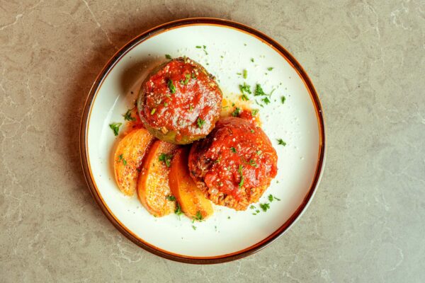 Layers of zucchini, eggplant, potatoes, and seasoned ground beef, finished with our homemade bechamel sauce