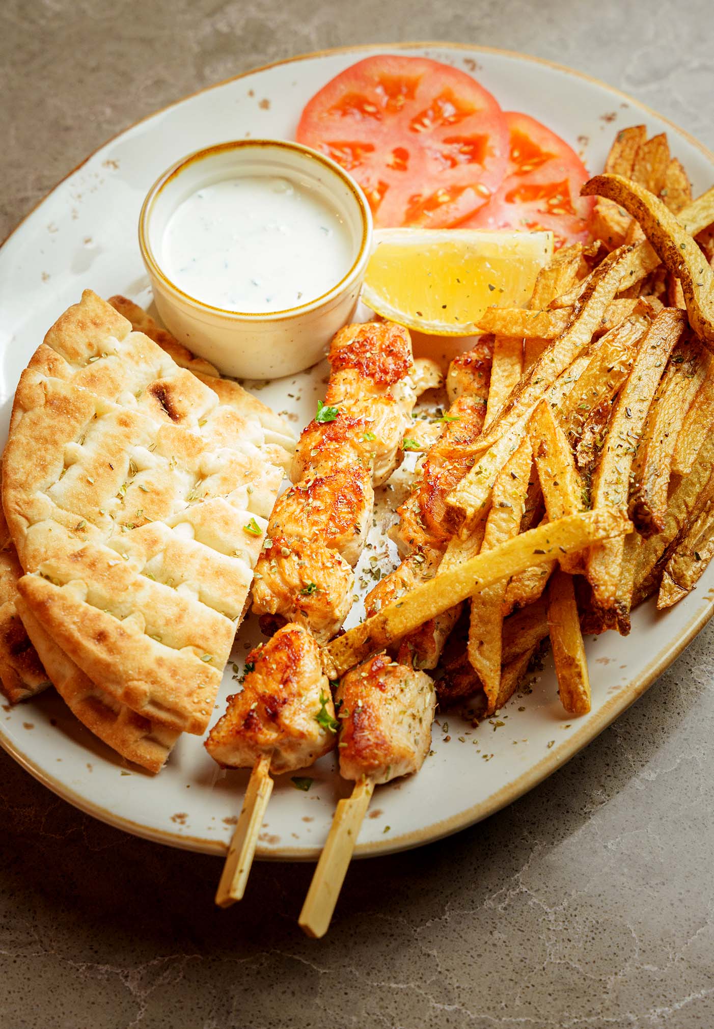 Oversize skewered house-marinated chicken, tomatoes, onions, and peppers with select Mediterranean seasonings served with your choice of 2 sides