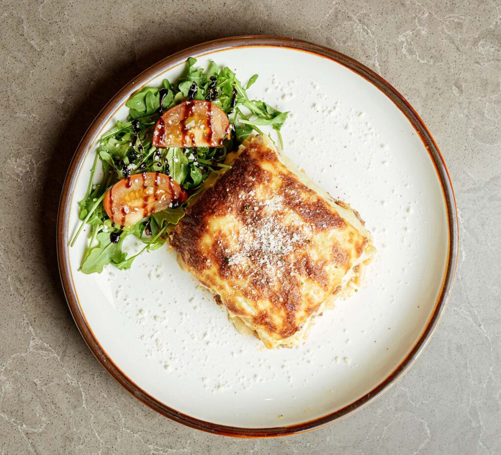 Baked pasta with seasoned ground beef, finished with our homemade bechamel sauce