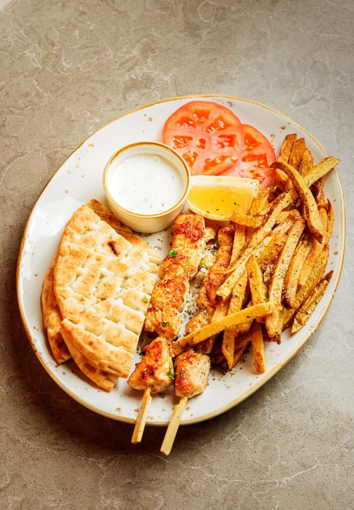 Served with Fresh hand Cut Fries, Sliced Tomatoes, Red Onions, Homemade Tzatziki and Greek Pitta Bread