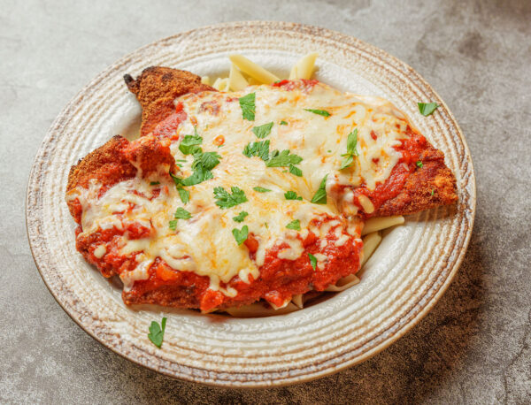 Crispy fried chicken cutlets, homemade marinara sauce, over your choice of pasta, topped with mozzarella cheese, and baked