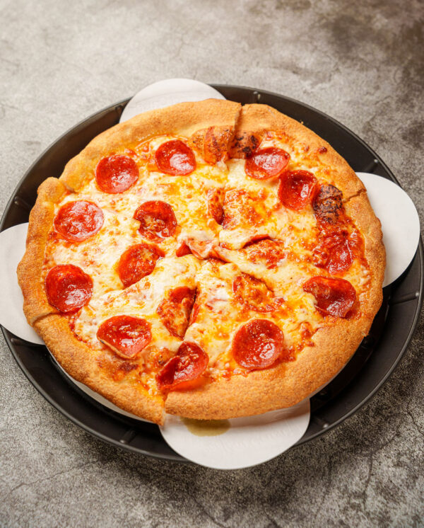 Homemade sauce, our house blend of assorted shredded cheese, and sliced pepperoni
