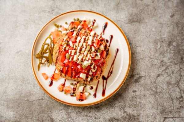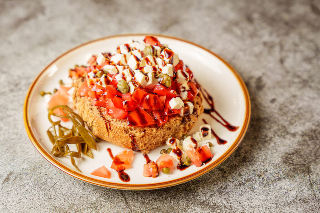Crisp barley topped with tomatoes, capers, and Greek feta cheese. Drizzled with Balsamic glaze